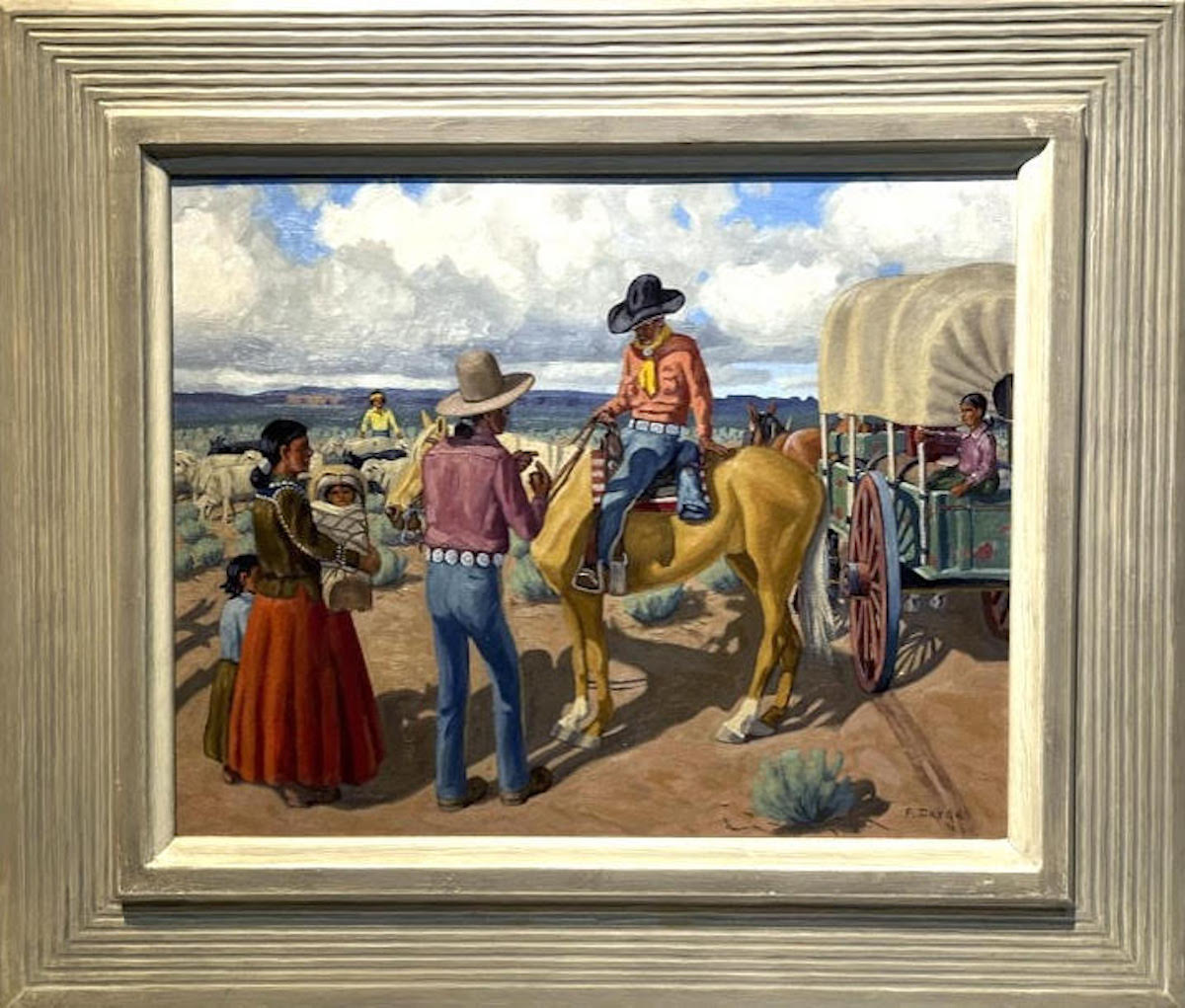 After the war, Darge embraced his wanderlust, retrofitting a WWII surplus ambulance into a mobile studio and camper. This vehicle allowed him to travel and paint on location throughout the American West. His work from this period included illustrations for a biography of explorer Zebulon Pike and paintings of daily life on the Navajo Nation, Native Americans in Taos, and the ornate Catholic churches of northern New Mexico. He was also drawn to the red sandstone formations of Sedona, Arizona, and traveled to Oklahoma’s Wichita Mountains Wildlife Refuge to paint bison, elk, and deer. Growing recognition of his art was bolstered by a solo exhibition at the Laguna Gloria Art Museum in Austin in 1948. By the 1960s, after more than three decades as a professional artist, he had produced countless canvases of Western themes and supplemented his income by teaching art. Darge passed away in the spring of 1978, having remained true to his vision of painting ordinary people and moments, which through his eyes became extraordinary.