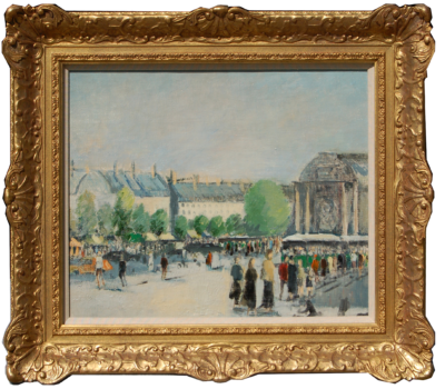 Cecile De Coene was the only daughter of the great Belgian painter Josef De Coene, so perhaps it was only natural that she should follow the family tradition. Her early studies were taken with her father but whilst still in her teens she received instruction from a friend of her father’s, the landscape painter Albert Saverys. It was the influence of Saverys that would dictate her artistic direction and, like her teacher; she would utilize a soft and delicate palette. She enjoyed painting still-lifes and seascapes but, more commonly, figures placed within the settings of a somewhat romanticized landscape. Impressionist in style, her works were highly regarded by the public and critics of her day and were frequently exhibited at many of Belgium’s most important art institutions. In addition, she was an exhibitor at the prestigious Salon des Printemps in Paris. In her mid-twenties she met, and shortly after married, the sculptor Albert Samain and together they were extremely active in the Belgian art community. This image of Paris can be dated to the late 1930’s and typifies her artistic approach. It came directly from the artist’s family and was signed on the reverse by the artist around 1975. Cecile De Coene died in the same town in which she was born, Kortrijk in 1985.