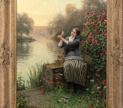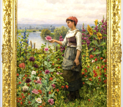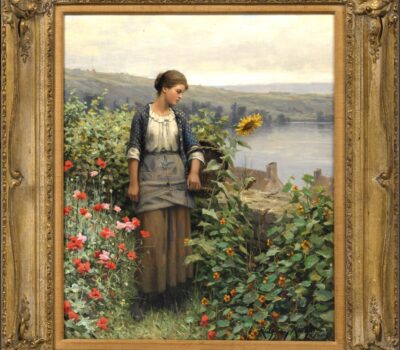Knight’s work exhibits the influences of his French Impressionist friends Pierre-Auguste Renoir and Alfred Sisley, also pupils in Gleyere’s atelier. The influences of other contemporaries including Jean-Francois Millet, Jules Bastien-Lepage and Jules Breton can also be identified. In contrast to these proponents of realism, Knight’s work depicts the “peasant-picturesque.” Young, pretty maidens stroll through scenic landscapes and bountiful gardens, there is nothing to indicate the economic hardships of the peasant class. Knight often used local peasant women as models, dressing them up costume and placing them in idyllic settings. In Summer Afternoon, Seine Valley the maiden stands in a picking garden in full summer bloom. Knight showcases his skills as a flower painter. Here in a field of poppies, lupine, sunflowers and dahlias the young maiden selects the best bloom to pick. The artist successfully captures the tender way in which the maiden holds the flower and her gaze as she admires it.