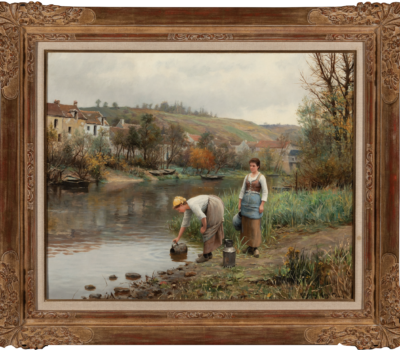 Daniel Ridgway Knight (1839-1924) was a prominent American expatriate artist working in 19th century France. He was born in Pennsylvania and attended the Pennsylvania Academy of Fine Arts along with Mary Cassatt and Thomas Eakins. In 1861, Knight went to Paris for two years to study at the Ecole des Beaux-Arts. He apprenticed under Charles-Gabriel Gleyere (1806-1874) and worked briefly under