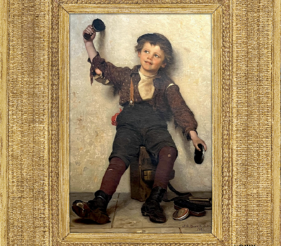 His Passing Show (Paris, Salon, 1877) and Street Boys at Play (Paris Exhibition, 1900) are good examples of his popular talent. Brown’s art is best characterized as British genre paintings adapted to American subjects. Essentially literary, Brown’s paintings are executed with precise detail, but poor in color, and more popular with the general public than with connoisseurs. His paintings were quite popular with wealthy collectors. Many of Brown’s paintings were reproduced as lithographs and widely distributed with packaged teas. He also painted some landscapes, just for pleasure.