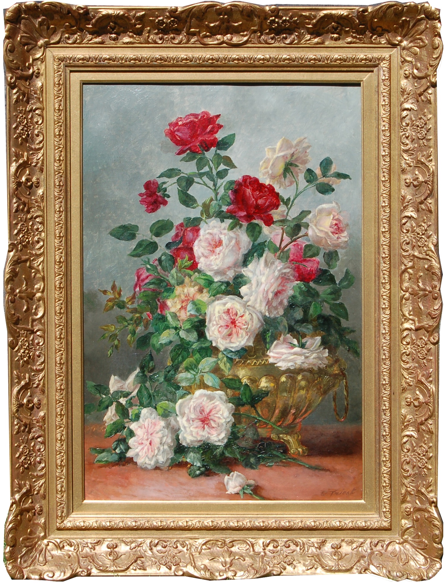 Camille Triest Van Mulders was born in Brussels in 1868 and, as a young woman, studied at the Brussels Academy. Here she was tutored by Jean Portaels, but arguably more importantly, Hubert Bellis, Bellis was a leading still-life painter of his day and cleary was the predominant influence on the young artist. In her late twenties, she moved to the suburb of Schaerbeek and established a studio. From here she submitted works for inclusion in a number of important exhibition venues including the Exposition de Casino in Ghent and the Société Royale des Beaux Arts.